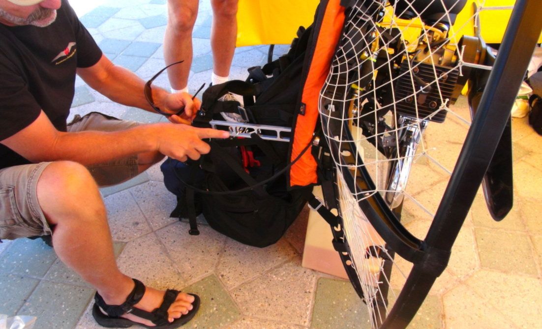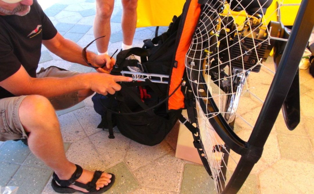 Rick Hunt pointing to swing-arm bars on Renegade plastic paramotor