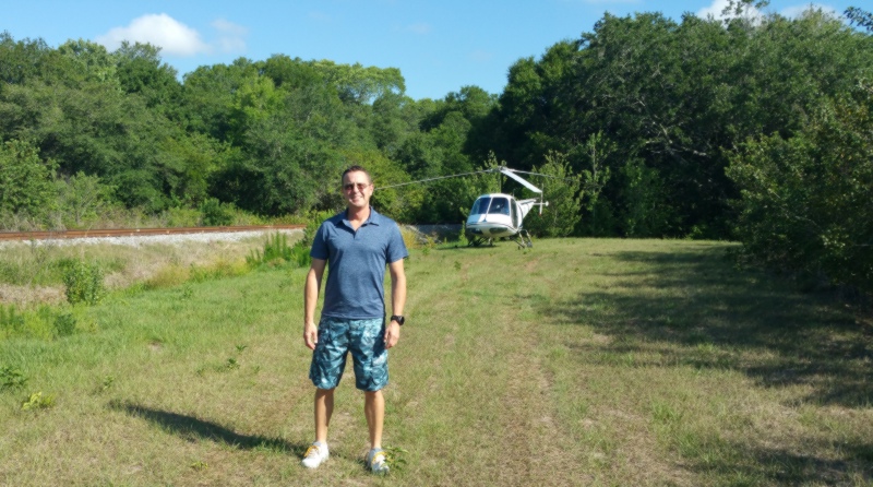 Tim standing in front of Ellie helicopter in field when picking up our Tesla by Jeff Goin | May 2, 2019