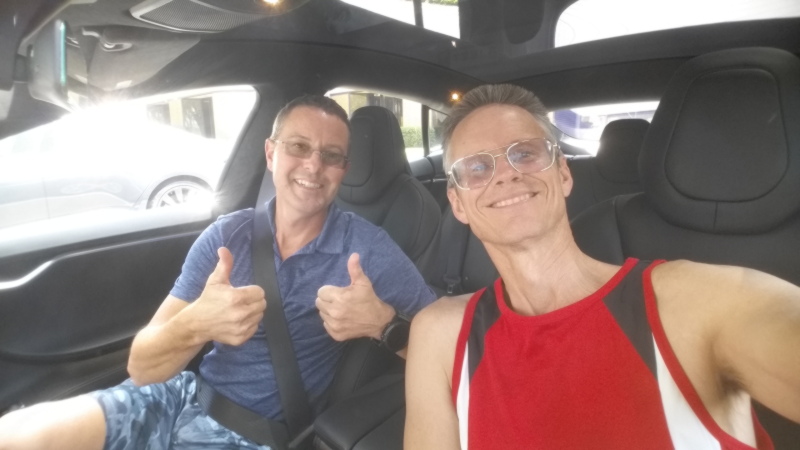 Tim kaiser and Jeff goin driving the Tesla for our first trip