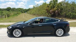 Tim driving Tesla in front of parked Ellie helicopter