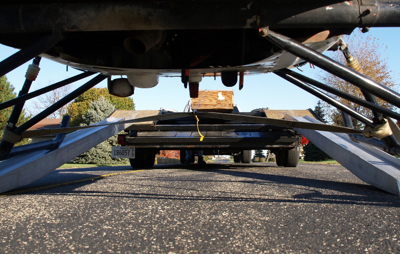 Helicopter being towed up the trailer