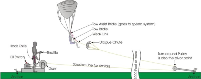Towing with turn-around pulley tow assist bridle weak link drogue chute